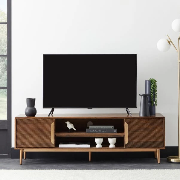 The stunning Anya Extra Wide TV Unit is the perfect choice for a stylish way to display larger TVs or if you like having extra space to decorate. Crafted from a beautiful, sturdy mango wood, the TV unit gets a contemporary edge with the brass finished metal handles and tapered legs that bring out the beautiful warm hue of the wood. This TV unit provides ample storage space for your games, tv boxes, books, and more with a shelving unit and cupboards on either side, with a contemporary carved design on the door.