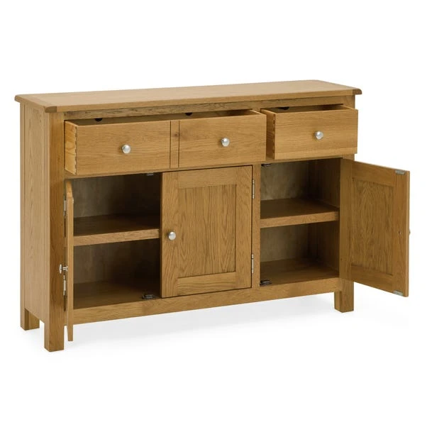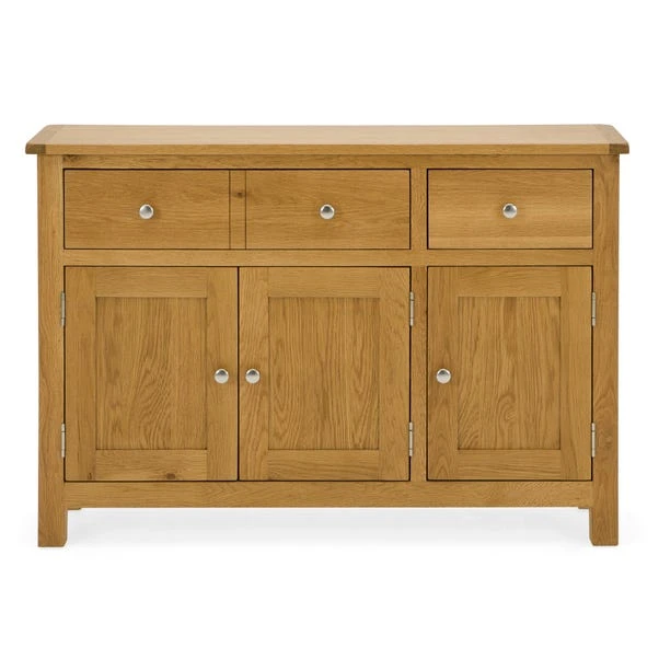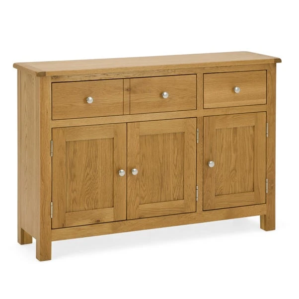 Designed to maximise storage space, this fully assembled sideboard features one wide drawer and a small drawer, complete with round metal handles. The Bromley large sideboard also comes with a single extra wide cupboard, complete with three doors and a fixed shelf inside for convenience.