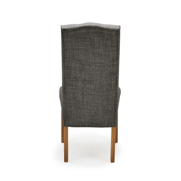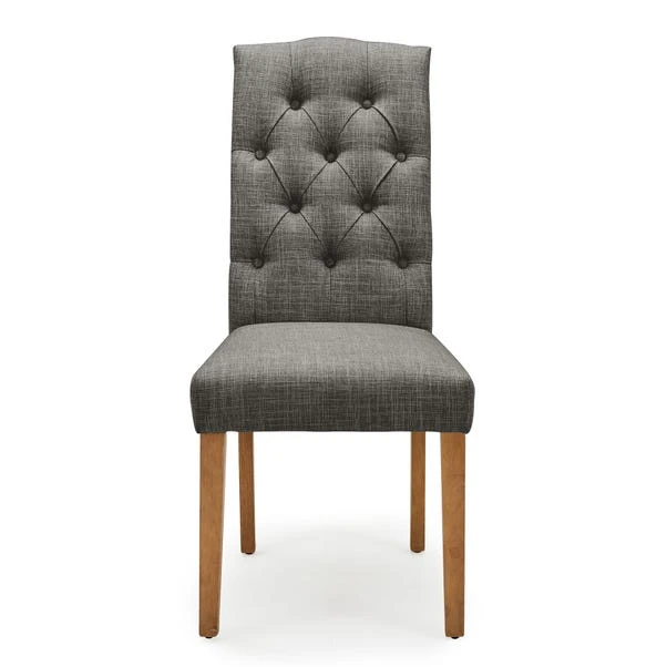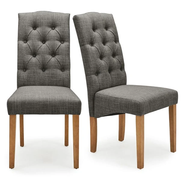 Boasting a timeless design, the Darcy set of 2 dining chairs are crafted in a traditional style with a curved back and linen look fabric upholstery, finished in a charcoal colourway. Featuring foam-filled seats and backrests, these part assembly chairs come complete with a stunning deep buttoned detail and oak finished, solid wood legs.