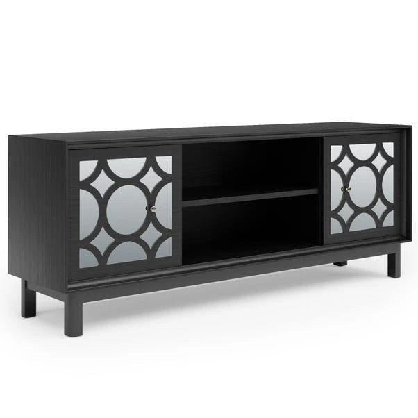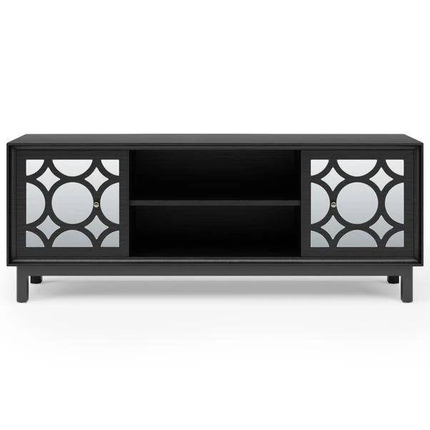 Stylish and sophisticated, the Delphi collection boasts an elegant styling, perfect for adding a contemporary touch to your home. The gorgeous range is finished in a black coloured ash veneer to showcasing the natural wood grain, whilst the carved pattern, mirrored fronts help to brighten your room and give the appearance of a bigger, lighter space. Crafted with solid wood legs, wooden runners and elegant metal handles, the stylish Delphi tv unit features two open shelves with cable holes and two stylish mirrored doors.