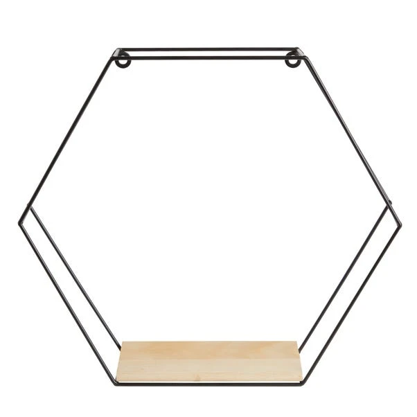 Constructed of a black, metal frame in the shape of a hexagon and finished with a natural wood shelf, these stylish shelves come in a set of 3. Perfect for showing off plants, trinkets, and other accessories, these shelves are made to be hung on the wall but can also be placed on a table or sideboard for a contemporary look.