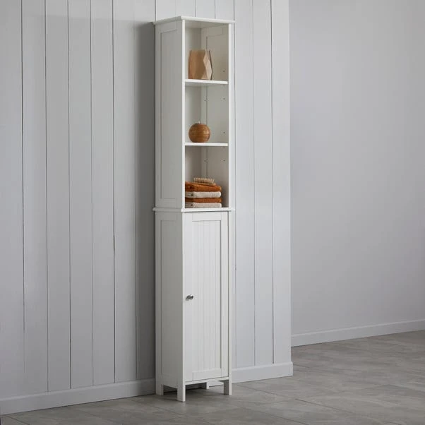 With a contemporary white finish, this tall cabinet is the perfect addition for any bathroom. This tall cabinet features 5 shelves, three open and two behind a hinged cupboard door with a chrome handle. Ideal for storing and displaying your bathroom accessories and essentials, this cabinet brings you a stylish storage solution that takes up little floor space due to its tall, slim design. Full assembly required.