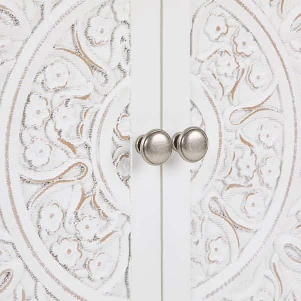 Elegantly designed with a detailed carved out pattern front, the Samira range features a simple yet clean, structured finish. A contemporary style, the Samira range boasts a chunky, wooden design along with beautifully finished metal handles and a natural lacquered paint surface.