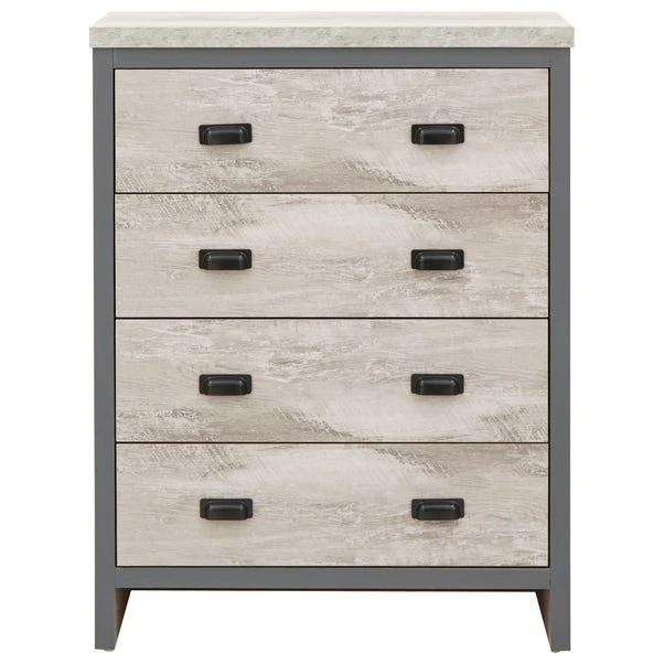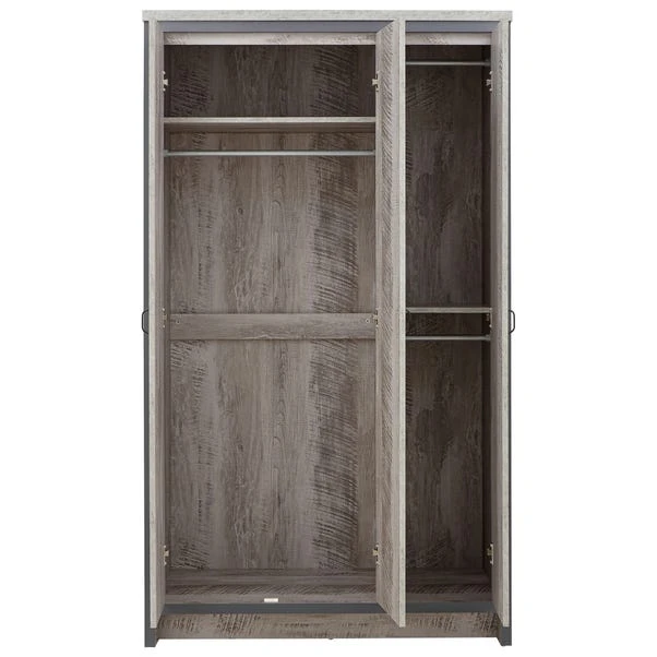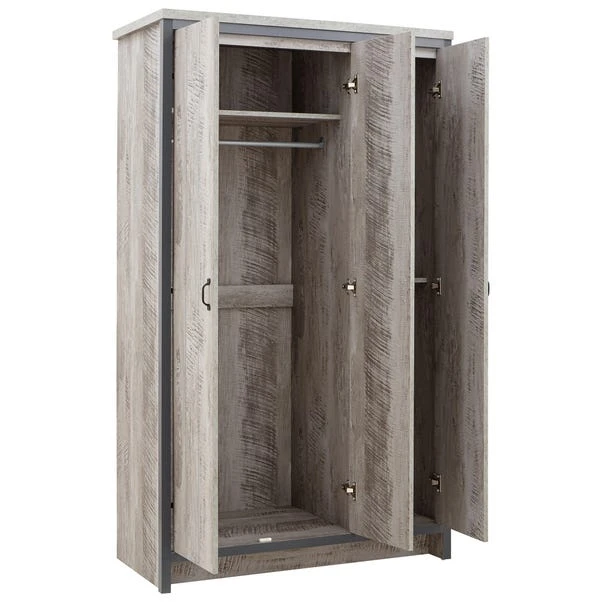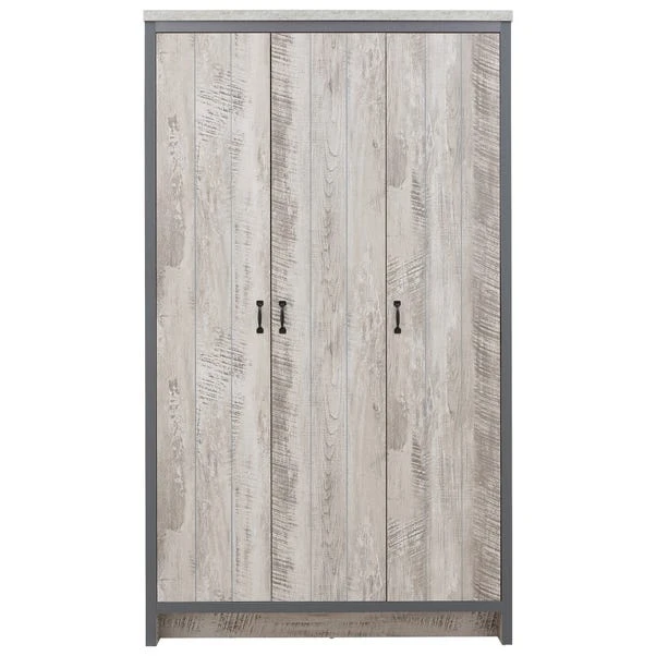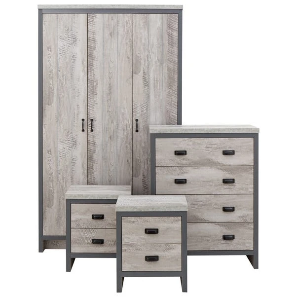 A complete bedroom furnishing set that will bring a splash of urban chic to any interior. Boston’s sturdy construction is finished with a superb distressed-effect and enhanced by black metal handles. The chunky panels are perfectly framed by the broad contrasting casing to create an industrial, reclaimed-style look. This set incorporates a three-door wardrobe with hanging and shelf space, four drawer storage chest and a pair of two drawer bedside tables.