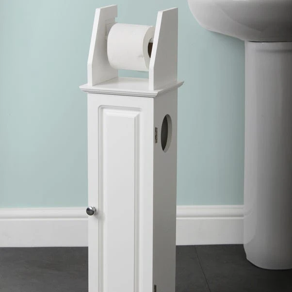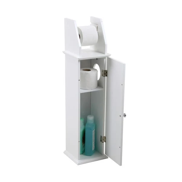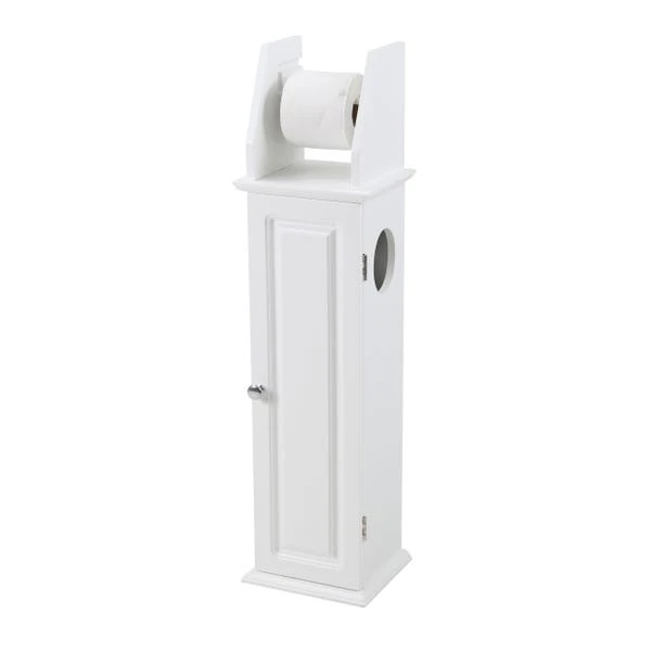 This toilet roll dispenser features hidden additional storage for surplus rolls with an open side viewing panel and chrome effect handle on the cupboard door. Flat packed and easy to assemble.
