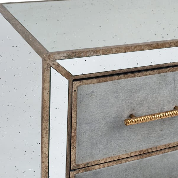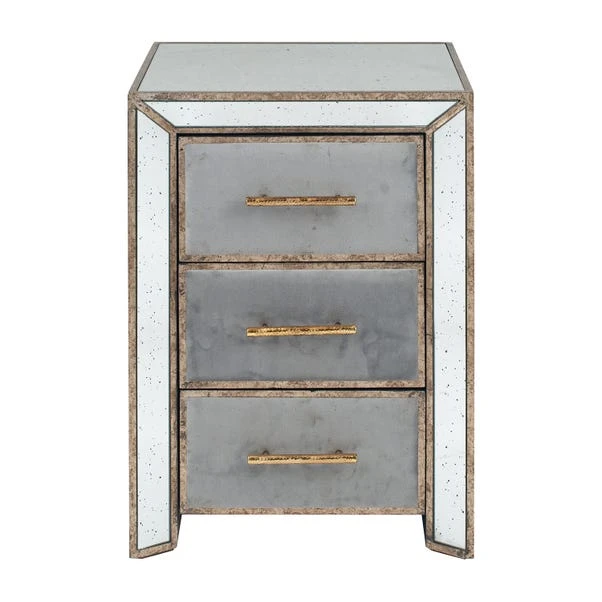 Keep this bedside table next to your bed so you can have all your night time essentials close by. The three extra drawers provide you with that bit of extra storage for your smaller clothing items. The mottled mirrored glass paired with the velvet drawers and antique gold detailing give this bedside table a pinterest ready look.